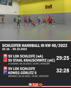 Das Schleifer Handballwochenende ist beendet, beide Schleifer Mannschaften konnten ihre Heimaufgaben für sich entscheiden. Die weibliche A-Jugend siegt gegen die männliche C-Jugend aus Krauschwitz, welche jedoch auch mit einigen Schleifern versehen war. Am Abend konnte sich dann die Männermannschaft des SV Lok gegen Koweg Görlitz ll durchsetzen, Endstand nach 60 Minuten war ein 32:28 aus Schleifer Sicht.